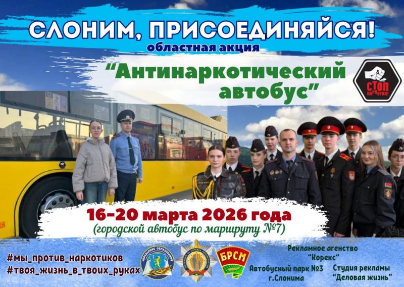 С 16 марта 2026 года в г.Слониме в рамках областной акции «Антинаркотический автобус» по маршруту № 7 начал курсировать необычный тематически оформленный автобус. Это брендированный автобус с интерактивом и профилактической информацией, в нем размещены различные плакаты, буклеты, QR-коды со ссылками на полезные интернет-ресурсы.
