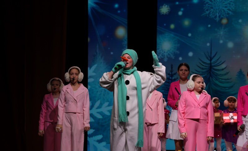 У входа ребят радостно встречали сказочные персонажи. Праздничная атмосфера царила и в фойе, и зрительном зале: множество новогодних фотозон, яркие гирлянды и веселая музыка создавали настроение чуда.