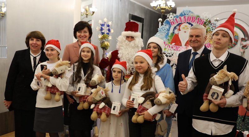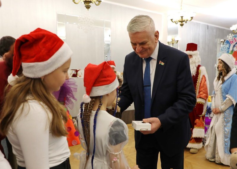 Поздравить детей с наступающими праздниками пришли депутат Палаты представителей Национального собрания Республики Беларусь, председатель Постоянной комиссии по государственному строительству, местному самоуправлению и регламенту Валентин Михайлович Семеняко, заместитель председателя Слонимского райисполкома Тереса Вацлавовна Юшкевич, начальник управления образования Слонимского райисполкома Светлана Викторовна Валько.