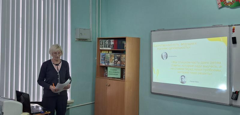 На открытом учебном занятии в 10 классе по теме «Лексика. Обобщение и систематизация» учитель русского языка и литературы ГУО «Средняя школа № 4 имени П.И. Батова г.Слонима» Городко О.А. продемонстрировала различные формы и методы работы, способствующие формированию функциональной грамотности учащихся. Анищик А.Э., учитель русского языка и литературы ГУО «Средняя школа № 3 г.Слонима», провела в интерактивной форме учебно-деловую игру по теме «Проектирование современного урока с позиции системно-деятельностного и компетентностного подходов с использованием активных и интерактивных методов обучения». Заведующий государственным учреждением «Слонимский районный учебно-методический кабинет» Волоскова О.С. акцентировала внимание педагогов на требованиях, предъявляемых к оцениванию учащихся и оформлению школьной документации.