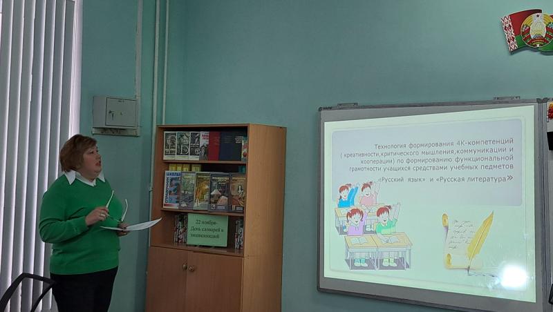 Учитель русского языка и литературы ГУО «Средняя школа № 4 имени П.И. Батова г.Слонима» Шундрик Л.М. поделилась содержательным материалом по использованию компетентностно-ориентированных заданий исследовательского, проблемного характера в работе с учащимися с различными образовательными потребностями. Ханцевич С.А., учитель русского языка и литературы ГУО «Средняя школа № 3 г.Слонима», представила современные подходы по реализации технологии формирования 4К-компетенций (креативности, критического мышления, коммуникации и кооперации) для формирования функциональной грамотности учащихся средствами учебных предметов «Русский язык» и «Русская литература».